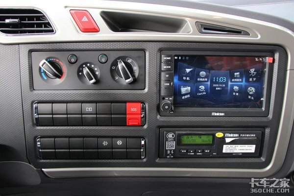 中控台的设计十分简洁,上面布置有不规则储物槽和卡槽,标配空调控制旋钮、大尺寸液晶显示屏、倒车雷达、行车记录仪按钮等。在左下方还设计了多个空按键,为个别卡友的选装预留出了按键位置。