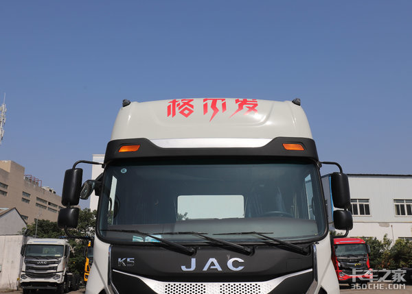 驾驶室顶部带有字体独特的“格尔发”字样,十分醒目。黑色的遮阳罩能大大减轻阳光直射对驾驶员视线的影响。车顶及遮阳罩两侧均带有示廓灯,能在夜晚行车时保障安全。