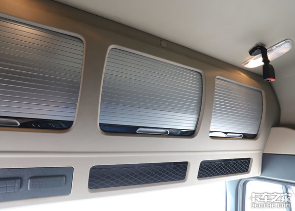 斜坡高顶的设计还带来了更舒适的内饰体验。整车在保证安全系数的前提下,采用底盘降高技术,驾驶室空间得到提升。上卧铺采用翻转卧铺,空间进一步得到充分利用。