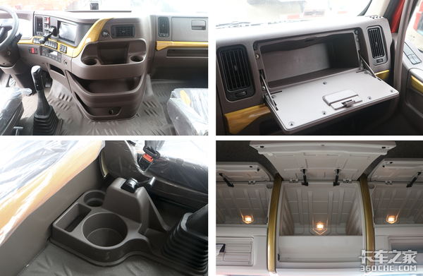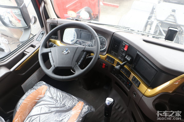 进入到乘龙H7驾驶室,金色元素从车辆外观延续到了内饰上,整个车厢内布满了金色装饰条。可以看到,在中控台、车门板、驾驶室顶部的储物箱等多地都有增加这种饰条,同时搭配上黑橙双拼色的座椅,给车内增加档次感的同时,也不会显得沉闷单调。