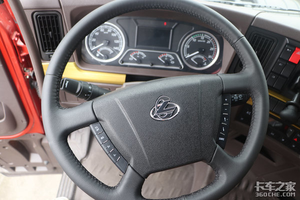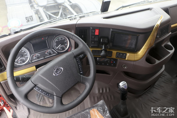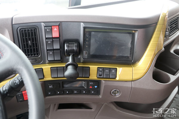 金色装饰条横贯中控台,带有木纹纹理,看着更显沉稳。驻车制动集成到了中控操作区域,驾驶员能够随手操作。配有多媒体触控屏,支持导航、影音娱乐、手机互联、车联网等功能。这款乘龙H7还配备有轮间和轴间差速锁,这样大大增加了车辆在泥泞路面、山区等非铺装路面上的脱困能力。