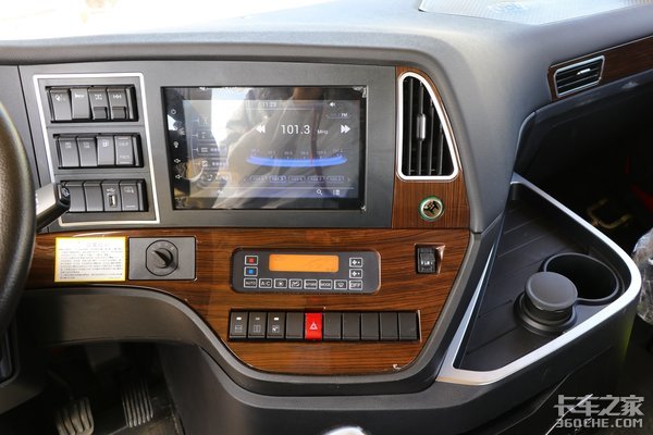 中控区域左侧布置有驾驶室翻转、轴间差速锁、轮间差速锁、ABS、后视镜电加热、节油开关等按键和USB接口,右侧布置有10寸车载大屏和自动空调等。中控台整体采用类似原木的装饰点缀,看起来比较精致。
