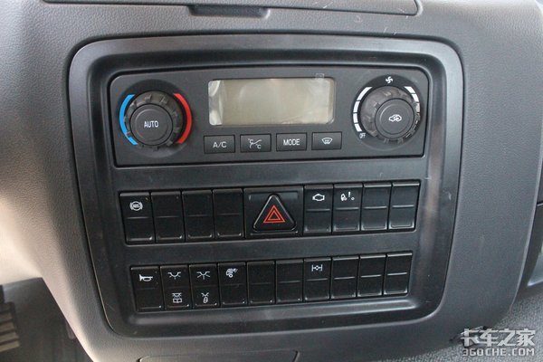 中控台下方布置有自动空调控制区域和驾驶室电动翻转、多处照明开关及轮间差速锁等按键,右下角是点烟器。