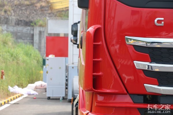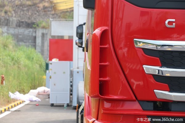 整车外观方面,这款杰狮C6继承了红岩杰狮的家族式设计语言,采用红色涂装搭配黑色中网和镀铬装饰,整体看起来线条凌厉,层次分明。