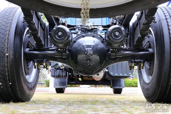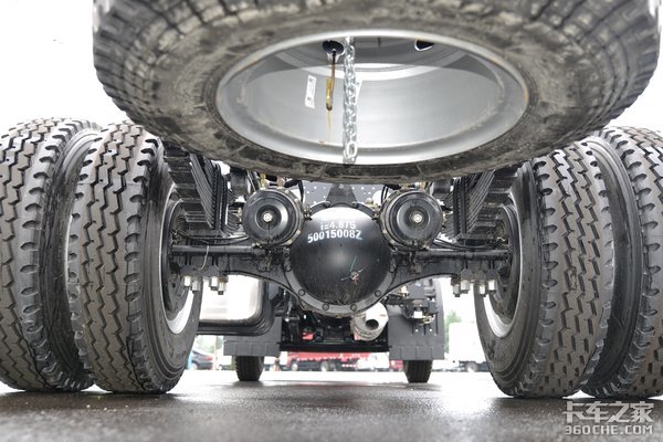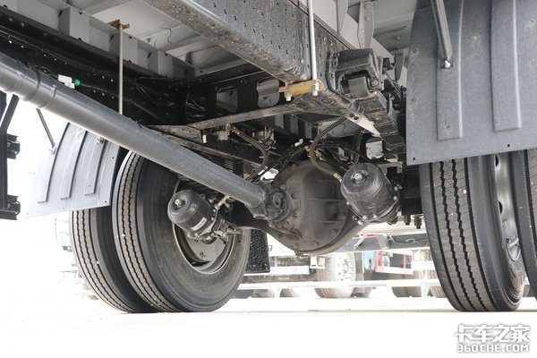 悬挂方面,该车采用前8后10+7的多片簧配置,额定载重9.995吨,承载能力有保证。并且使用邦乐6.8T后桥,后桥速比为4.875。