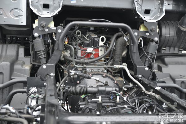 该车搭载安徽康明斯B4.5NS6B220直列四缸柴油发动机,排量4.5L,最大220马力,在1300-1500转的区间可爆发出最大820牛米的扭矩,满足国六排放标准。与之搭配的是法士特8JS85TC手动8挡变速箱,采用直接挡设计,最高档速比为1。该变速箱采用全同步器设计,挂挡灵活轻便,以及较好的燃油经济性。