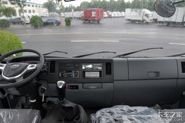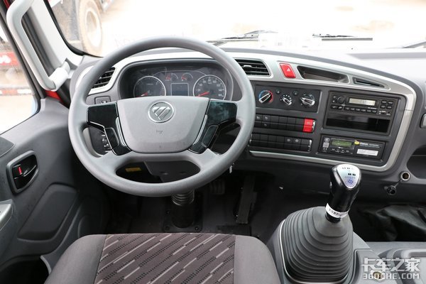 驾驶室内的中控台整体设计比较低调沉稳,且具有层次感,看起来更倾向于轻卡的风格。这里集成了多媒体机头、空调控制面板以及行驶记录仪等设备,还设置了一个卡槽和储物盒。方向盘使用江淮中卡惯用的盾形四幅设计,两侧集成定速巡航、蓝牙电话和多媒体控制按键。