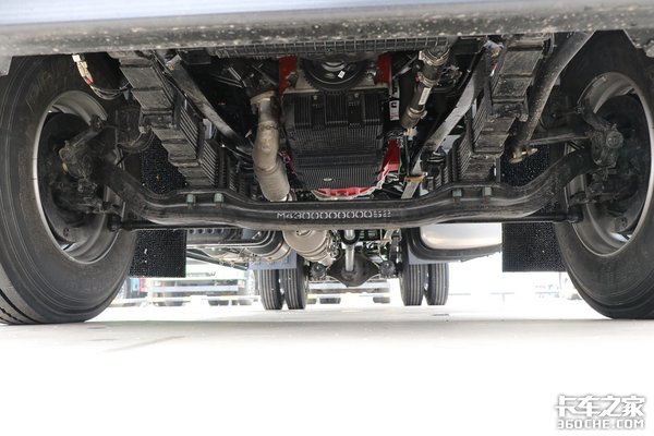 悬架方面,采用前10,后10+8的多片簧配置,具有较高的承载能力。虽然国六后处理系统占了较大空间,但整个底盘的布局规整度较高。铝合金材质的油箱和符合材料的尿素溶液罐以及铝制变速箱箱体都能让整车轻量化设计更到位。