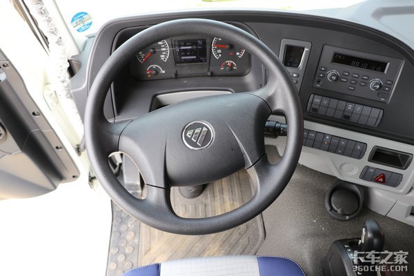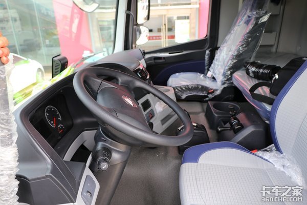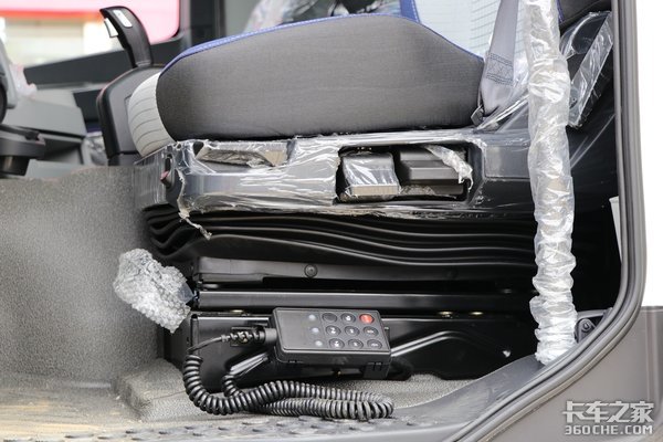 主驾驶座椅配置了多项调节的气囊减震座椅,配上四点悬置的驾驶室,能够更好的减轻长途驾驶的疲劳感。全车的座椅是选择蓝+米白色的颜色拼接设计,整体观感都良好。
