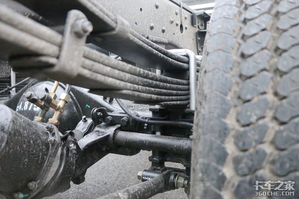 悬架方面,该车使用前3后5+2的多片簧设计,以此增强整车的承载能力,后桥允许载荷为2499KG。该车使用4.5T后桥,速比为4.875。