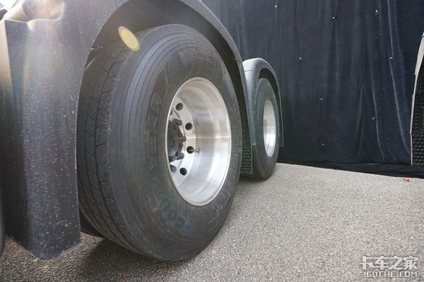 整车轮胎规格为295/80R22.5,转向轴内置爆胎应急装置,在发生紧急爆胎的情况时,可以保证车辆继续直线行驶一段时间,避免转向轮因一侧轮胎失压而造成车辆方向失控。