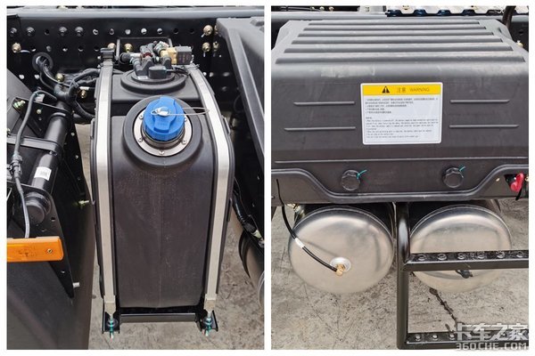 实拍车的前桥采用汉德前桥,后桥采用汉德425冲焊桥,后桥速比3.7。采用前2后3少片簧的悬挂形式,在保证承载型的同时,又可以降低车身自重。这款车的油箱采用铝合金壳体,800L的容量可以说是很大了,一整趟下来可以减少加油的次数,更加高效,轮胎的规格为12R22.5。