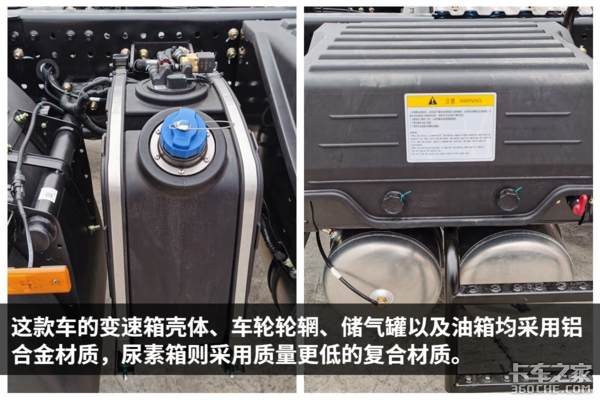 在轻量化方面,这款车也没少下功夫。这款车的储气罐、车轮轮辋、变速箱外壳以及储气筒,均采用铝合金的材质。不仅质量轻,并且也非常的耐磨。并且这款车的前2后3少片簧的悬挂形式,也为减重出了不少力。由于现在国家对超载这一块比较重视,想要多拉货还是要在卡车自身下功夫。