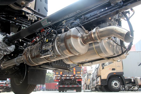 后处理通过EGR+SCR+DOC+DPF+ASC路线达到国六排放,因此排气管看起来也比国五车更复杂更粗壮。