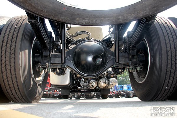 实拍这款大黄蜂装配的是8T级轻量化后桥,速比有4.33、4.56以及4.875三种可选,悬挂采用10/10+8式多片簧,可以看到该车在轻量化同时保证承载力方面毫不含糊,能装就是实力,明显该车能够满足用户更多的装载情景。