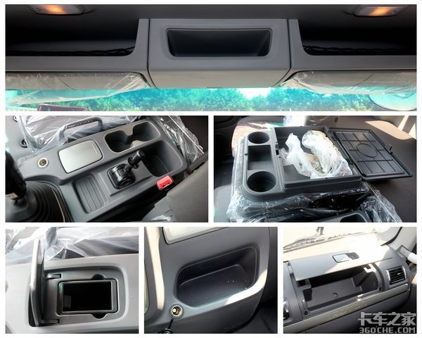 驾驶室最上方是三个共83L的超大顶置文件柜。另外,在副驾前方、主副驾之间、门板上等位置都设计有不同容积的储物格,能够满足用户置放日常小物品的需要,方便查找的同时也能保证驾驶室内的整洁。