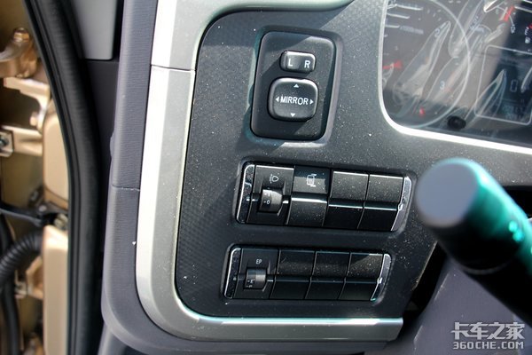 方向盘的左下方还设置了一个按钮功能区域,包括后视镜电动调节、电加热以及大灯高度调节等功能按钮,驾驶员伸手就能调节功能开关,非常方便。