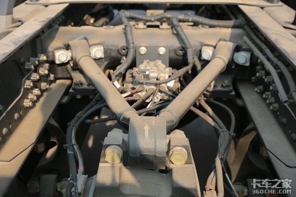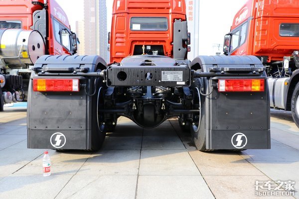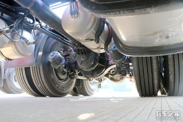 悬架上,采用前2后3的少片簧设计,直接照顾了整车轻量化的设计。采用13T MAN单级后桥,后桥速比3.7。该车重量8.6吨,总质量25吨,牵引总质量为40吨。铝合金材质的油箱、变速箱外壳以及复合材料的尿素罐都为整车轻量化设计做出贡献。