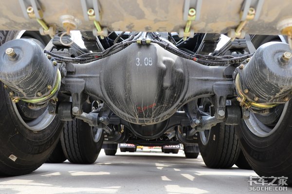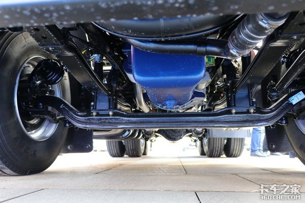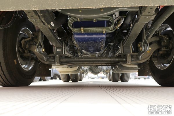 悬架上,采用前2后3的少片簧轻量化设计,并使用435升级冲焊后桥,后桥速比为3.7。V型推力杆的设计让车架不易产生位移,保证行车稳定性。该车配备800L的油箱,铝合金箱体和铝合金轮辋、铝合金变速箱壳体都采用轻量化设计。
