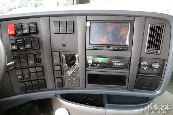 中控区域配备一个多媒体机头以及牵引车常规的基本功能按键,空调控制旋钮在下方。该车采用包裹式驾驶舱,带来的好处在于换挡杆、杯架以及各类储物盒会更近一些,更有驾驶专属感。