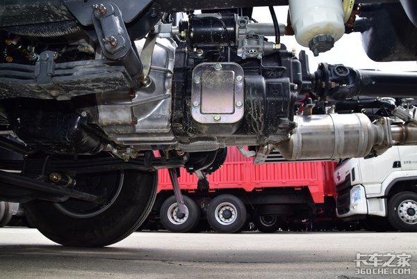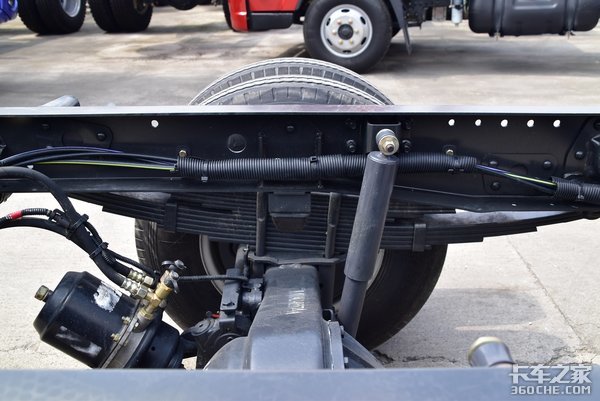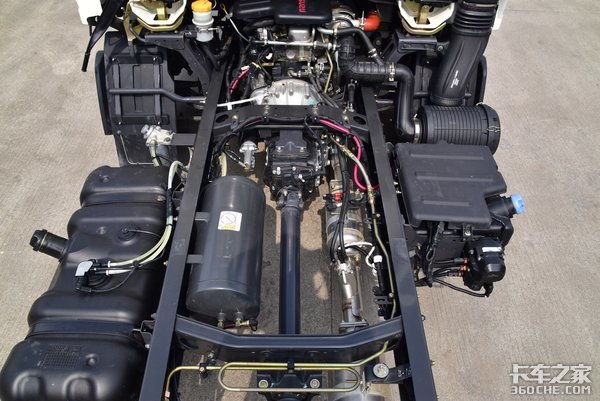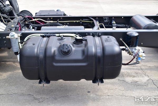 车架右侧则主要集成了空气滤芯装置、车辆电源以及尿素溶液罐。而整个后处理系统被设置到了车架内侧,给车架外留出大量空间,卡友可根据需要加装一些功能装置。