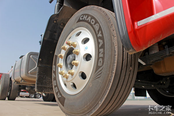 实拍车在底盘方面除了成熟的动力链匹配亮点外,还配备了全车铝合金轮圈,铝合金轮圈相比普通铁质轮圈具有更强的稳定性和抗压性,同时重量也会更轻。在轮胎方面,实拍车配备的是来自朝阳的275/80R22.5型号轮胎,主打经济、高效、噪音低。