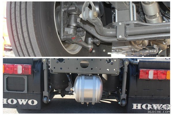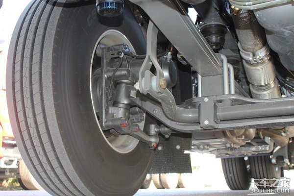底盘方面,这款车的前桥采用HR7前桥,制动系统为盘式制动,后桥采用MCY13单后桥,采用四气囊空气悬架,盘式制动 ,后桥速比3.36。
