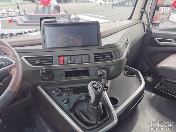 中控台的变化还是很大的,多媒体液晶显示屏改成12寸悬浮式中控大屏设计,看着很有乘用车的感觉。中控台上其他的按键布局也发生了一些优化和调整,变速箱操作杆和驻车手刹还是布置在中控台上,这样更方便驾驶员的操作。