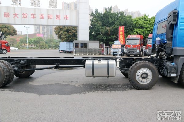 车架右侧集成了尿素溶液罐、干燥罐以及油箱。铝合金材质的油箱能够降低一部分车辆自重,达到轻量化设计的目的。另外,该车配备规格为11.00R20的轮胎,考虑燃油经济性的同时,也兼顾了耐用能力。