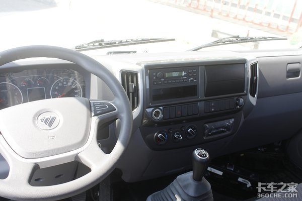 整个驾驶室看上去还是比较简约,布置有USB插口及一个24V电源接口,可以选装彩色中控大屏,为行车过程中更添加一份乐趣。而且因为手刹位置比较靠后,座椅可以转化为一个较平的卧铺,可以进行短暂的休息。