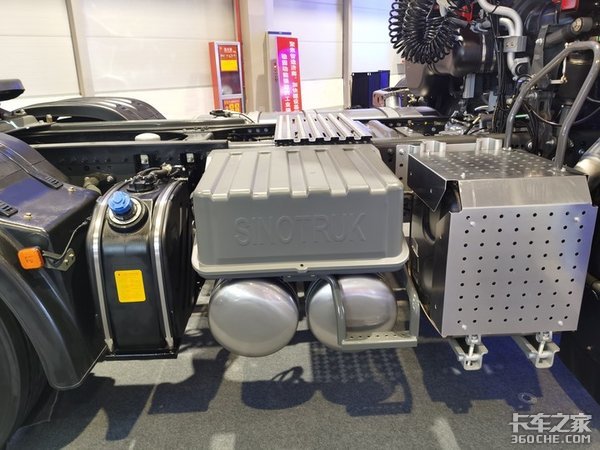车架左侧集成了容积为750L的油箱,右侧则是后处理系统、电瓶、储气罐以及尿素溶液罐。大量铝合金和复合型材质的应用有助于降低车辆自重。配备规格为12R22.5的轻量化车轮,轻量化设计下的整车自重仅8.081吨,将更多的载重空间留给了挂车,在合规的情况下拉的更多。