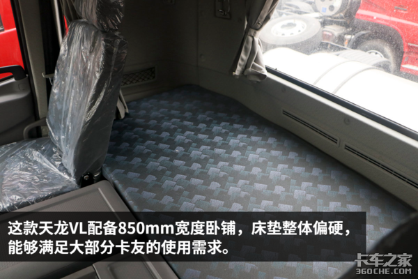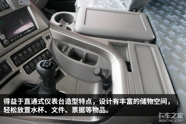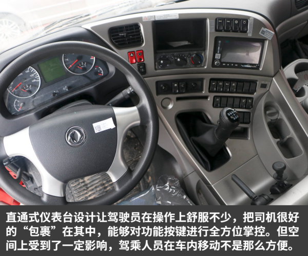 东风天龙VL凸地板设计让驾驶室内的活动空间显得相对局促不少,好在高顶设计增加了一定空间感,能够轻松站立起来。直通式的仪表台不仅操作更加方便,还有效利用空间进行多样化设计,带来了丰富的储物设计。当然,主副驾之间的移动就不是那么方便了。