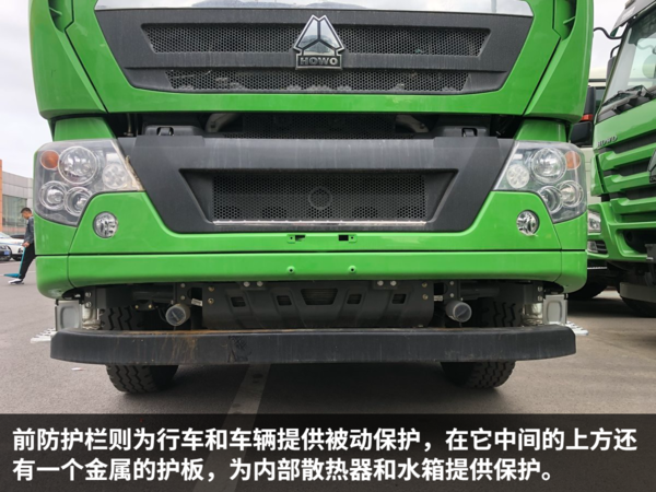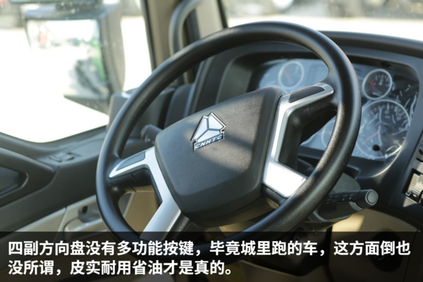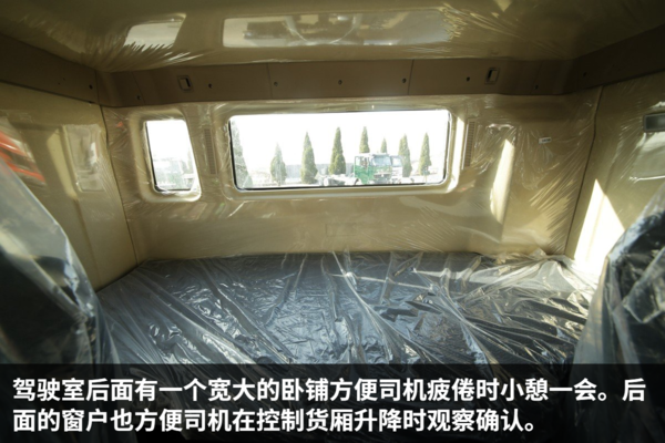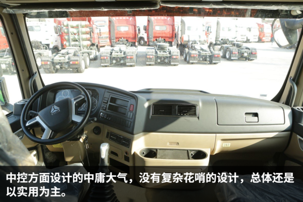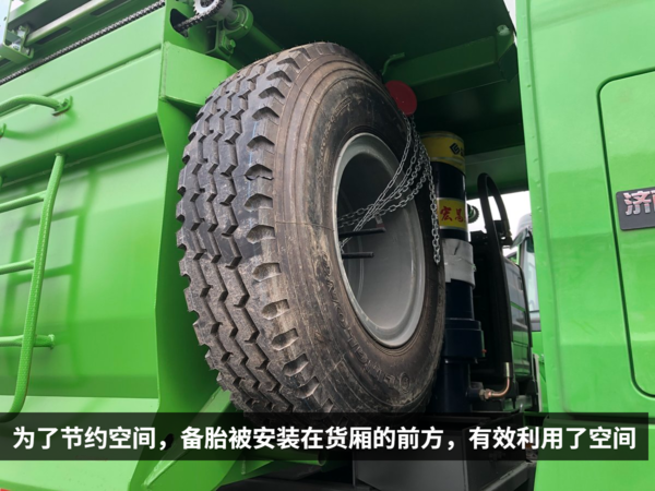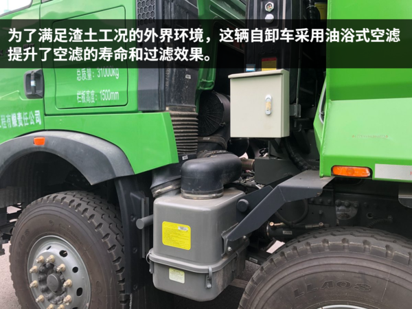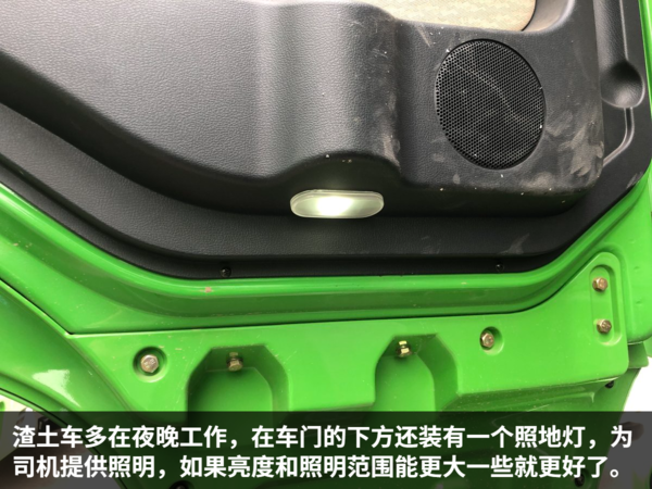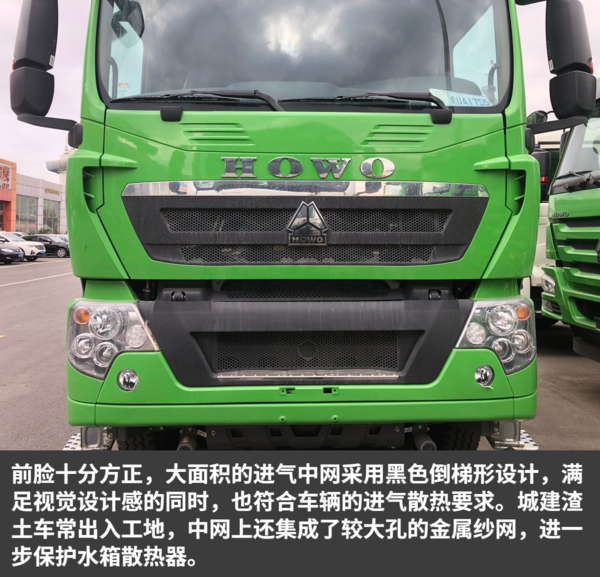 各地的城建渣土清运车的颜色都有统一要求,在北京销售的自然就是绿色。这种翠绿色的颜色非常醒目,远远一看就知道是渣土车辆。由于是城区道路为主,考虑到限高的问题,这辆HOWO自卸车采用平顶驾驶室。