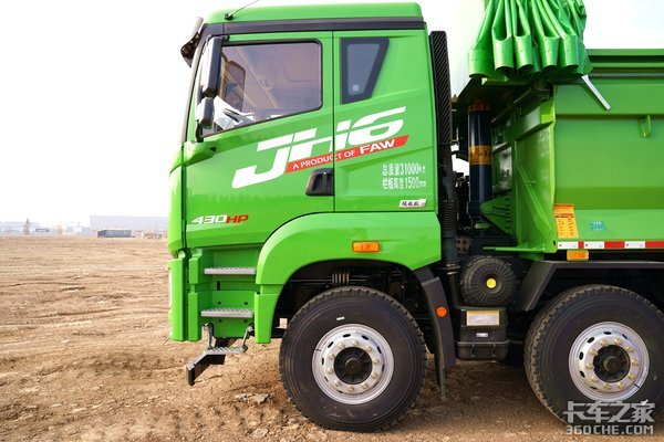 来到车身侧面,能够看到这台JH6 8×4短轴领航版自卸车的驾驶室纵向宽度还是非常不错,整体延续了普通版JH6的良好传统,这意味车内的纵向空间将更为宽敞,能够更好满足车内的休息以及储物需求。