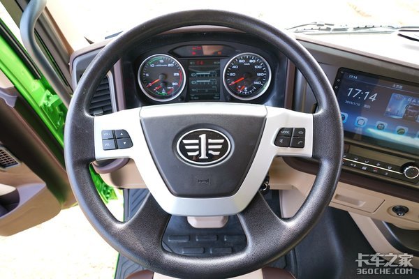 坐到驾驶室内首先映入眼帘的就是这款多功能方向盘,这款方向盘采用了目前解放青汽的最新造型,通过方向盘即可控制多媒体系统的接打电话以及音量调节,使用起来还是非常方便。