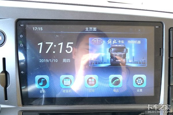中控部分这台JH6 8×4短轴领航版自卸车配备了一块十英寸的车载大屏,这块屏幕支持解放行车联网系统、蓝牙音乐、接打电话等功能,可以很好丰富驾驶员车内的娱乐需求,让开车不再枯燥。此外还标配四方位视频包。