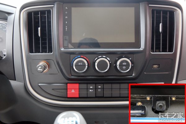 控台区域比较简洁大方,配有MP5,可以进行影音娱乐,另外也能够显示倒车影像,MP5的正下方,则是电动空调,可以使驾驶室内舱保持一个恒温的状态,在其两边则布置有电子点烟器和一个USB充电口,危险警示灯、雾灯等开关也是布置在中控台处。