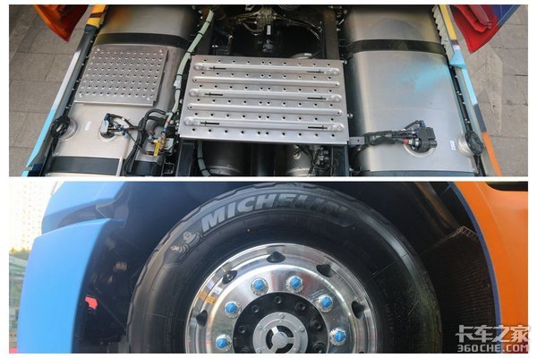 实拍车搭载有双油箱,采用铝合金材质的壳体,两个油箱加起来的容积有1220L,同时带有燃油切换阀、燃油水加热等功能。轮胎选择的是米其林轮胎,轮辋为铝合金材质并且,轮胎规格为12R22.5,采用2/4前钢板后气囊的悬挂形式,后悬架采用8气囊设计,气囊高度可调,方便卡友装卸货物和甩挂运输,非常贴心。