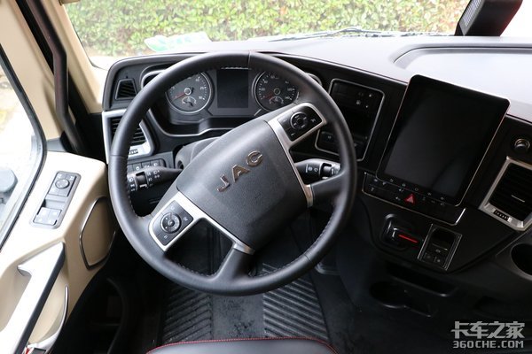 这款格尔发K7采用的是高顶排半驾驶室,平地版的设计让车内的整个空间看起来更大,标配有一键启动功能,驾驶室整体采用浅米+深灰的配色搭配,看起来非常温馨。