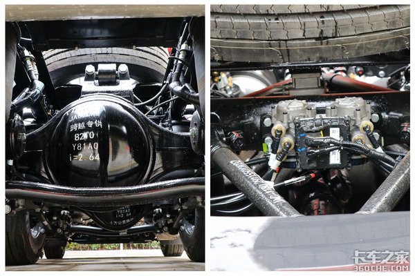 这款车的前桥采用锻钢件,工字形断面,盘式制动器,后桥采用单级减速,后桥速比2.64,采用八气囊的空气悬挂形式,并且气囊可以进行升高或降低的操作,方便卡友们日常装卸货物和甩挂运输。