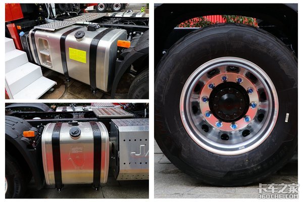 这款车装有一大一小两个油箱,均采用铝合金壳体,容积加起来有900L,轮胎选择的是米其林X Line轮胎,轮胎规格为315/70R22.5,轮辋也是铝合金的材质。
