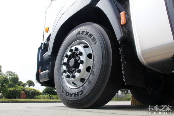搭载10条型号为AZ565+的朝阳轮胎,规格为12R22.5,这款轮胎采用四条直线型花纹沟辅以窄横沟,具有优异的直线行驶性能和防湿滑性能,更适合在铺装路面行驶。