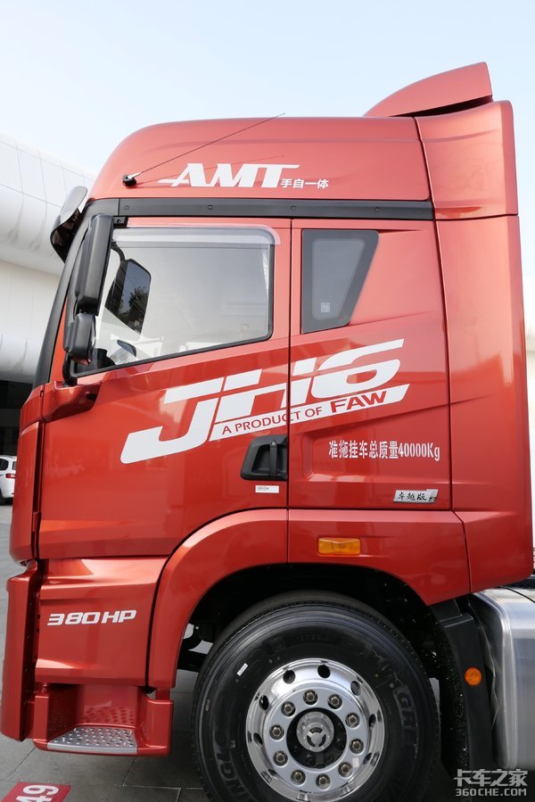 来看车身侧面,这辆JH6驾驶室采用了大排半设计,内部空间更加宽大,驾驶室更加舒适,车顶大大的AMT字样表示这辆车是自动挡车型。