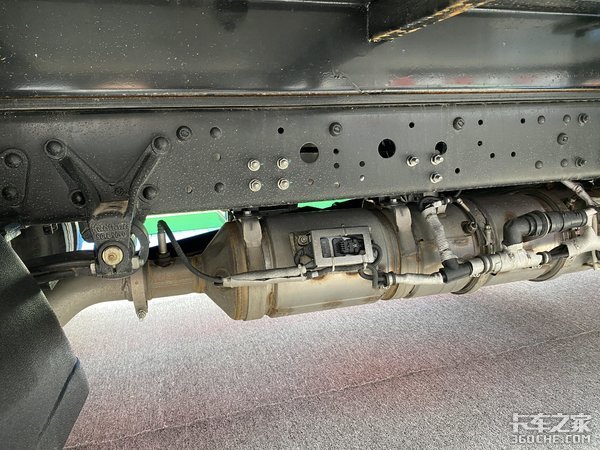 在车架外侧有防护栏,可以有效阻挡砂石等尖锐物品对底盘零部件造成损坏。车辆后处理系统被放置在车架内侧中,一方面保护了设备整体,另一方面也提高车架空间利用率。