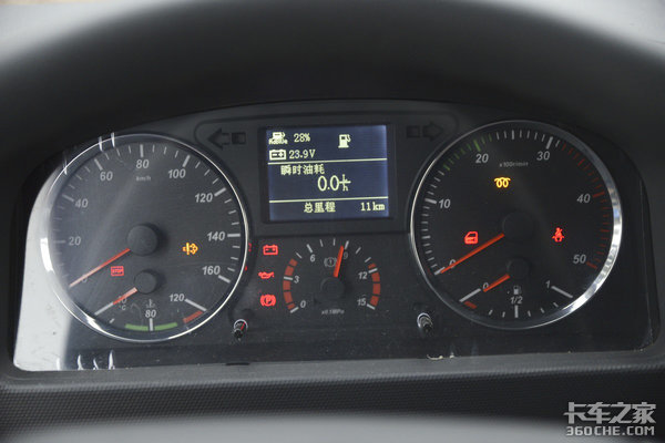 圆形仪表盘采用黑底白字设计,车辆信息读取比较方便。左侧时速表下方为水温,右侧转速表下方为剩余油量,中间下部分为储气罐气压表,上方配备有一个液晶屏,尺寸不大,能够显示瞬时油耗、总里程、保养等数据。