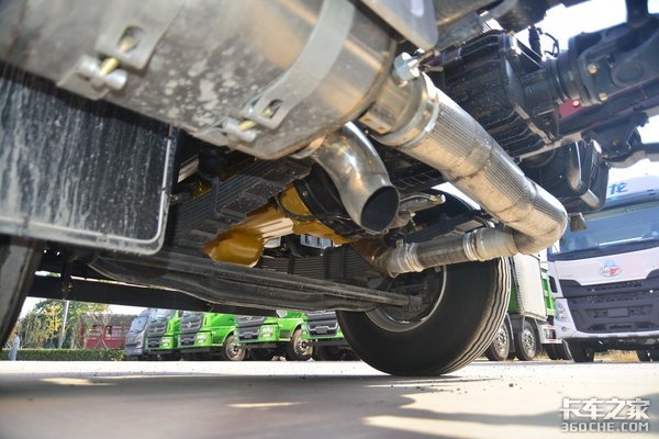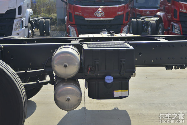 车架左侧前两轴之间设有后处理系统,第二轴和第三轴之间则是铝合金储气筒、蓄电池和尿素罐。从图上可以看到,乘龙这种模块设计给旁边预留出了不少改装空间,卡友可以后期增加淋水器或者工具箱等。