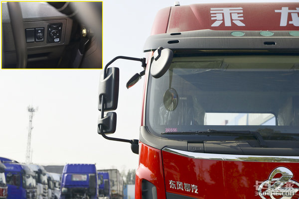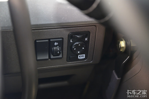在方向盘左侧位置,设有大灯高度调节(根据货物不同装载量调节灯光的照射角度)、电动后视镜调节(通过L、R以及方向按键来进行调节)、后视镜加热按键(通过电加热来清除后视镜上附着的雨雪、雾气等)。