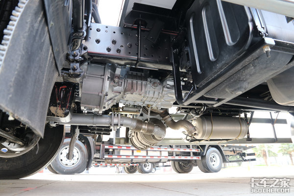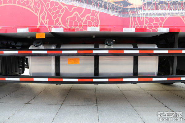 整车装配有双腔油箱,油箱容积目测在600L左右,用户可以在主副油箱中分别加注高标号和低标号的两种燃油,配合油箱加热功能,不用担心极寒天气下发动机启动不了。油箱材质为铝合金,有利于整车轻量化。油箱外侧安装有防护栏,可防止意外情况对油箱造成损伤。