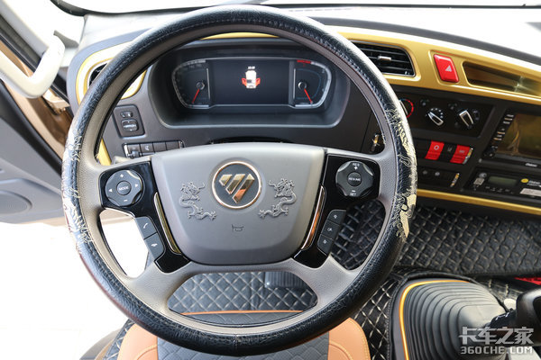四辐式方向盘集成有多功能控制按键,方向盘左侧集成有多媒体控制按键,可实现音量调节和接打电话等功能,右侧集成有定速巡航按钮,长时间行车时合理使用定速巡航功能,可进一步减轻驾驶疲劳。方向盘中间采用两条龙纹饰与烫金的钻石车标装饰,与驾驶室前脸双龙戏珠的设计遥相呼应。