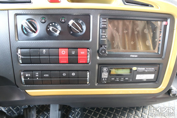 中控区域各功能按键排列整齐,整体看起来十分丰富。左侧分布有空调、车道偏离预警系统、油箱加热、主副油箱切换、DPF再生开关等按键,右侧分布有中控大屏和行车记录仪。